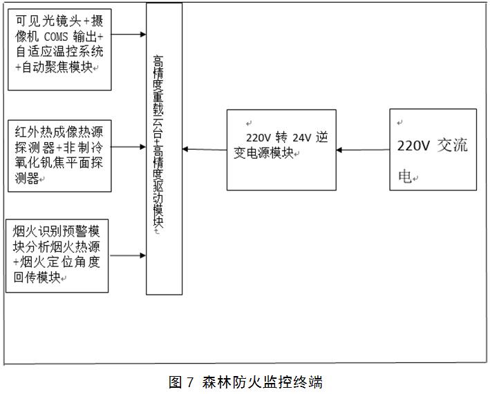 森林防火監(jiān)控預(yù)警分系統(tǒng)由監(jiān)控終端、傳輸網(wǎng)絡(luò)和后端管理平臺等三部分組成,采用可見光和紅外熱成像雙光譜煙火識別系統(tǒng)及后端監(jiān)測管理軟件實(shí)現(xiàn)對森林防火區(qū)域監(jiān)控范圍內(nèi)火情的“自動掃描、自動發(fā)現(xiàn)、自動報(bào)警、自動定位”。