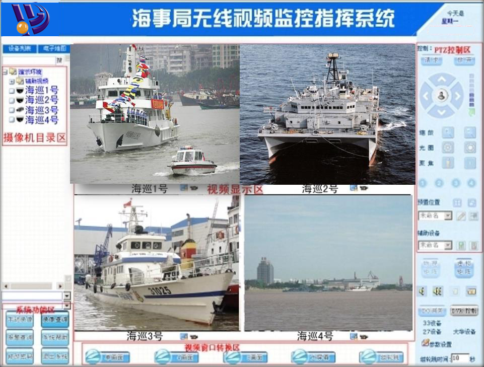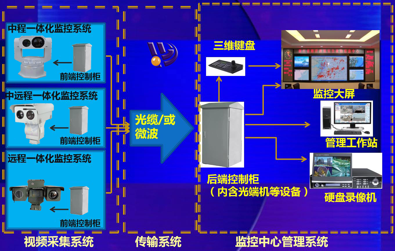 系統(tǒng)主要由監(jiān)控管理中心系統(tǒng)、傳輸系統(tǒng)、前端采集系統(tǒng)、夜視照明系統(tǒng)、云臺控制系統(tǒng)、電源系統(tǒng)和設(shè)備基礎(chǔ)設(shè)施等組成。它能夠全方位、全天候觀察航道船只、人員活動等情況,是一種能夠?qū)崟r監(jiān)控和發(fā)現(xiàn)緊急情況、迅速組織指揮調(diào)度的新型電子技術(shù)監(jiān)控系統(tǒng)。值班人員可在值班室完成對海洋周邊情況進(jìn)行實時監(jiān)控,指揮員也可在監(jiān)控中心通過監(jiān)視器畫面了解海面情況、指揮工作。從而實現(xiàn)海洋管理監(jiān)控實時化、指揮決策科學(xué)化,達(dá)到合理使用海洋資源,有效保護(hù)海洋生態(tài)環(huán)境的目標(biāo)。